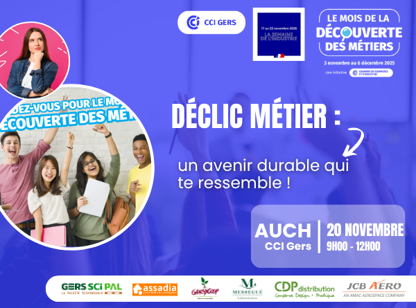 Dans le cadre du Mois de la Découverte des Métiers, la CCI du GERS organise, le jeudi 20 novembre 2025, un Speed-Meeting intitulé “Déclic Métier : un avenir durable qui te ressemble !”